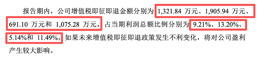 在微薄的利润中,税收优惠的支撑作用不容忽视。招股书显示,2023年公司增值税即征即退返还款1905.94万元,占当年利润总额的比例高达13.20%。而2024年该项仅691.10万元,占比降至5.14%。税惠的波动对利润总额产生了直接扰动。