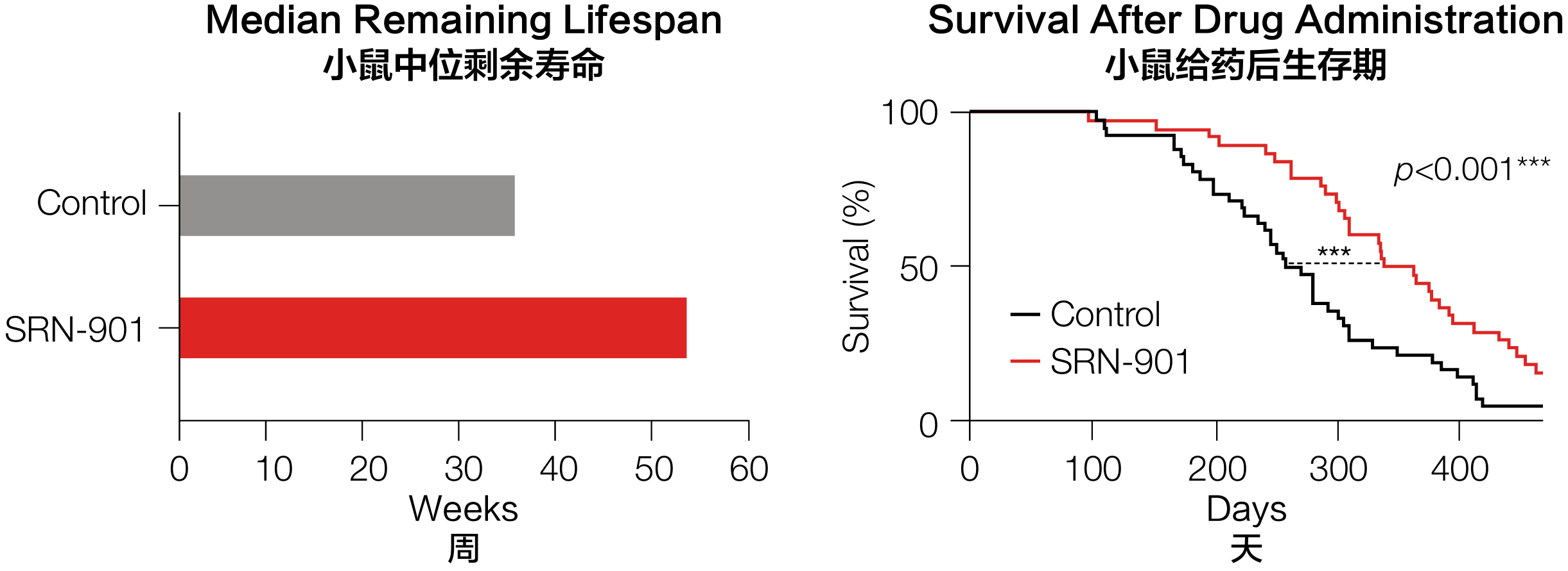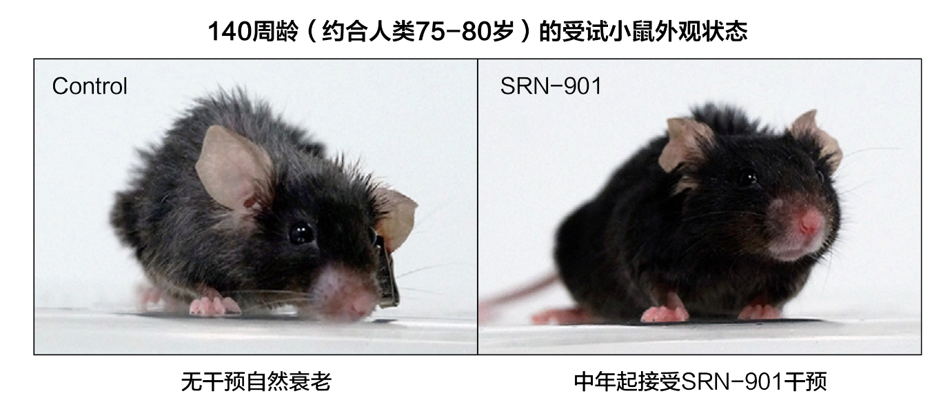 数据显示,从小鼠中年(相当于人类50多岁)开始给药,SRN-901组实验动物的剩余寿命破纪录地延长了33.02%;老年小鼠体能从不足年轻时的20%提升至50%,皮肤、毛发、运动机能等生理功能的衰退均被显著抑制,达到了目前口服衰老抑制剂的最高水平。